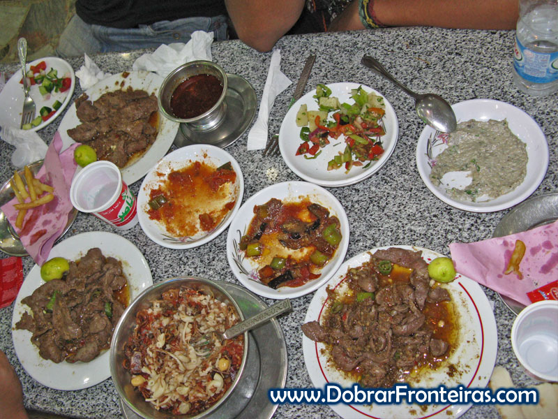Depois de resolvido o problema do alojamento fomos procurar jantar num restaurante recomendado pelo rapaz do hotel: Comemos vários pratos que faziam lembrar os petiscos tradicionais portugueses: fígados, rins, umas saladinhas, etc, e os indispensáveis miolos fritos, que fazem parte de qualquer menu egípcio. Parecem uns pequenos medalhões panados, em que lá dentro está uma massa branca. É saboroso desde que não pensemos o que estamos a comer. Seguindo o ritual terminamos a noite a beber chá e fumar shisha.