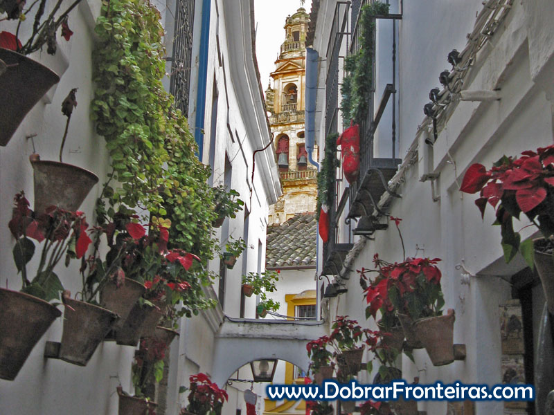 Não pode perder a Rua das Flores, uma pequena rua muito típica de Córdoba, com os tradicionais vasos de flores pendurados nas paredes, e com vista para a torre da catedral.