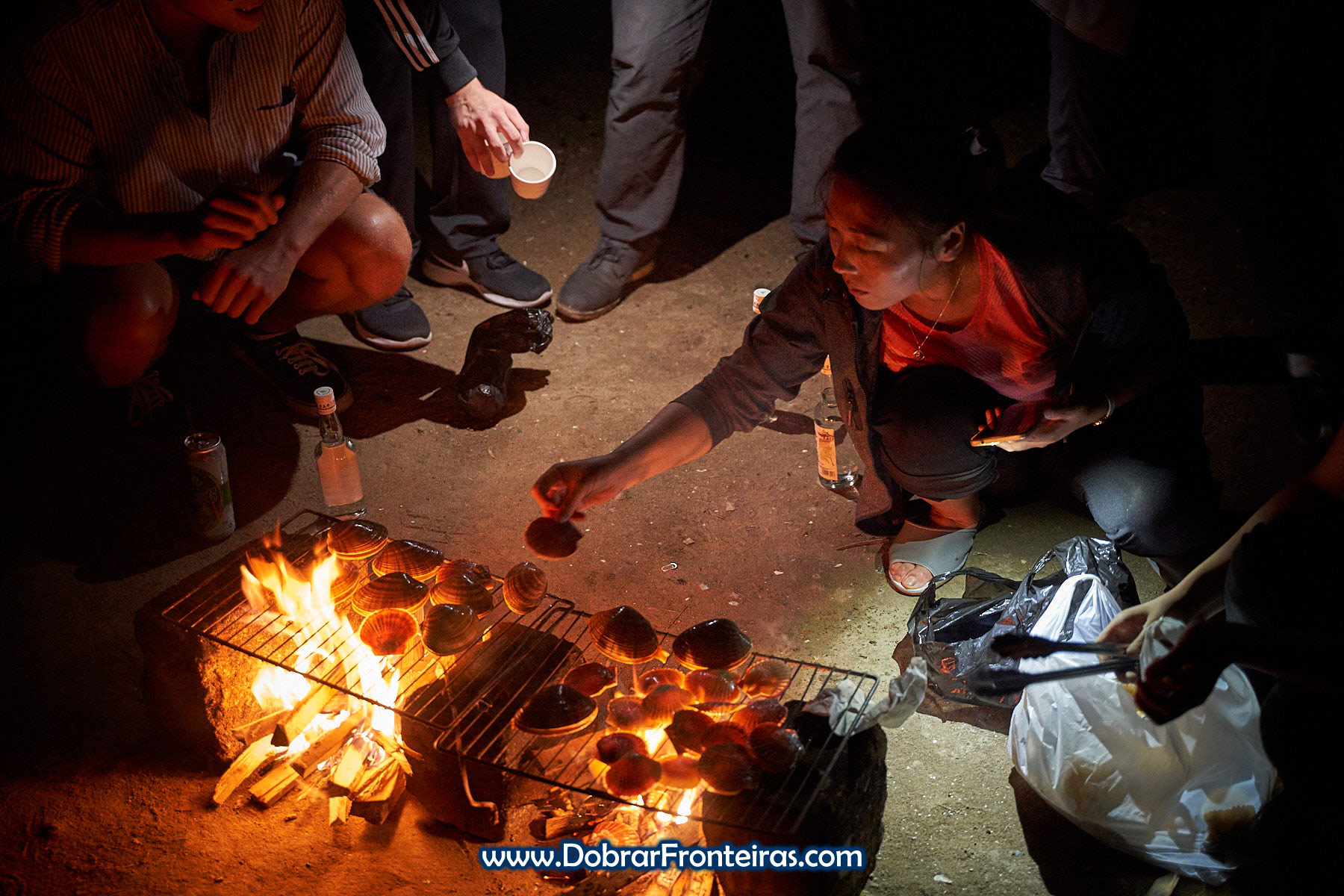 O jantar, para além das milhentas entradas, inclui uma sopa de algas com uns pequenos peixinhos. Há noite era suposto fazermos um churrasco de vieiras na praia, mas a chuva e uns pequenos insectos que dominam o areal empurram-nos para um abrigo onde comemos as vieiras acompanhadas de cerveja e soju, a bebida tradicional coreana.