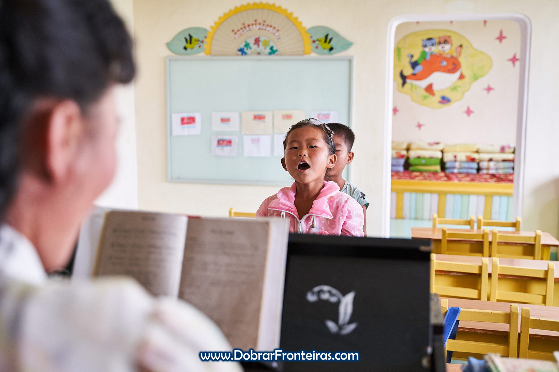 Estava à espera de ver maquinaria, de entrar nas hortas, de ver as colheitas. Em vez disso somos conduzidos ao jardim de infância onde nas várias salas as crianças se alinham e cantam para nós acompanhadas ao piano pelas professoras. No seus rostos não há sorrisos mas sim um claro desconforto com a nossa presença.