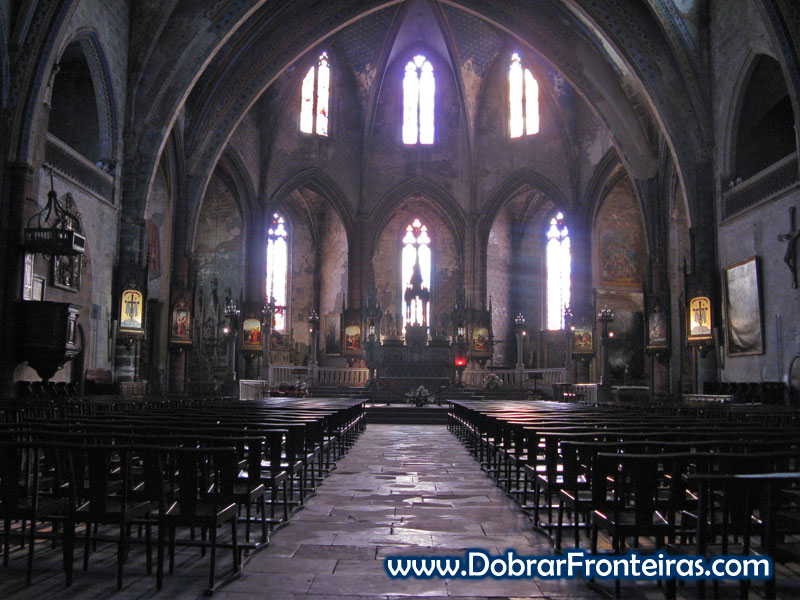 Apenas de uma nave, enorme, o interior é escuro. Não há luz artificial, apenas a que entra pelos seus belos mas pequenos vitrais. Parece saída dum filme de cavaleiros medievais. Por entre várias obras de arte descubro alguns quadros muito bons.