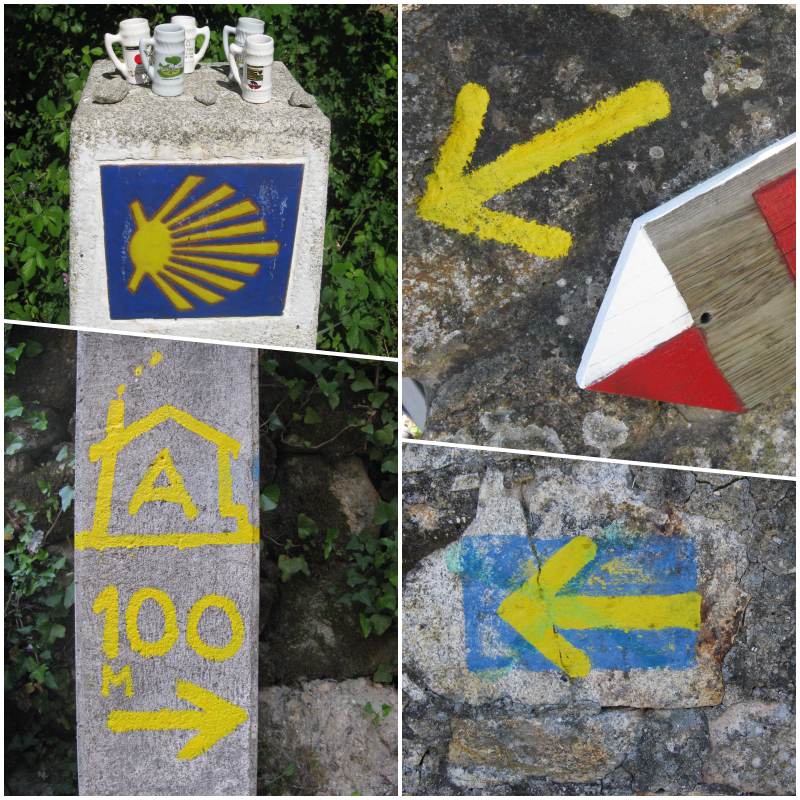 Fotos de algumas das centenas de setas e mojóns que se podem encontrar a indicar o caminho português de Santiago.
