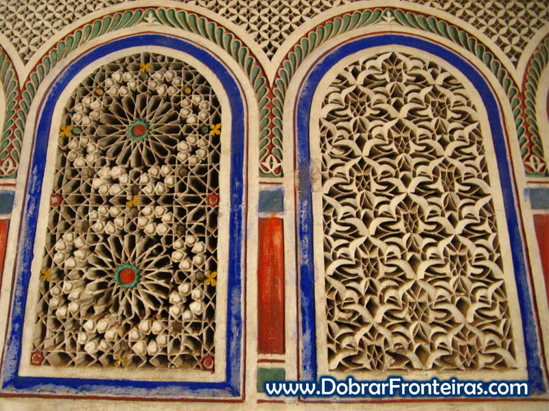 O interior do topo da cúpula é em pedra ricamente esculpida, um exemplar único da belíssima arquitectura árabe. Fica mesmo em frente ao Museu de Marraquexe e à Mesquita de Ben Youssef.