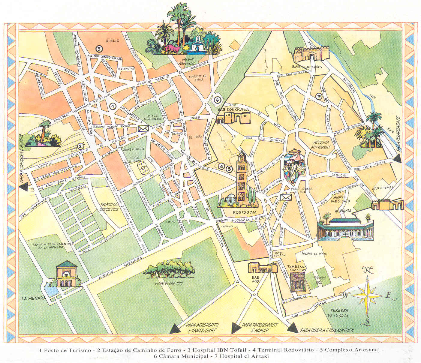 No extremo Sul da cidade encontra-se o palácio Real e mais a Sul, também rodeado de muralhas o jardim de Agdal, onde crescem árvores de fruto tais como laranjeiras, oliveiras, figos, etc.