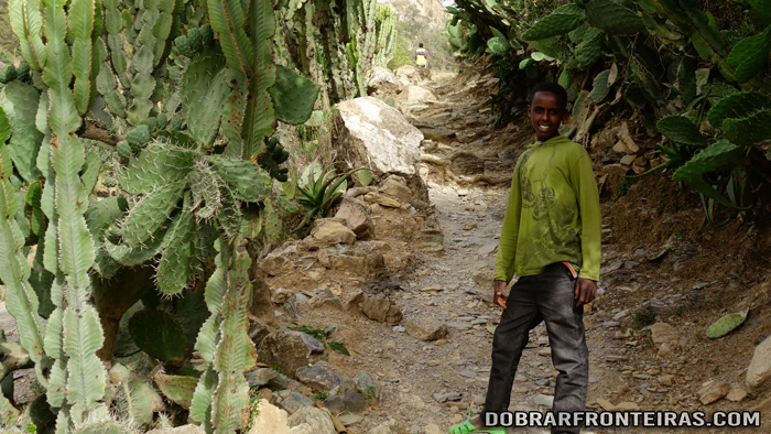 Nos dois quilómetros que separam esta igreja da de Medhane Alem Adi Kasho falamos dos poços e da dificuldade de obter água, dos cactos que os agricultores usam como vedação dos terrenos, da escola, dos seus sonhos e dos miúdos que nos perseguem pedindo dinheiro. Aproveito para lhe explicar como isso é mau para ele e para a imagem do país.