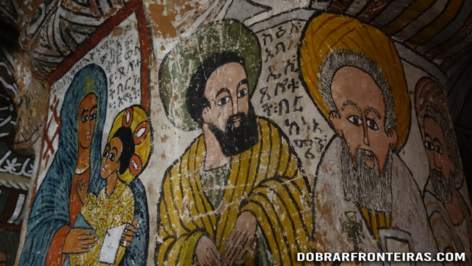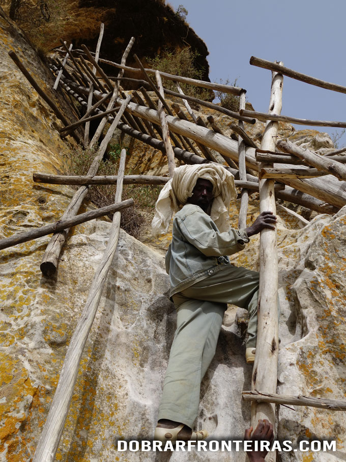 A primeira que visitei foi a de Pedro e Paulo que se encontrava logo ali no penhasco à nossa frente. Depois da árdua subida a Debre Damo da parte da manhã, subir pelos precários degraus de pedra e madeira até este igreja foi uma brincadeira de crianças.