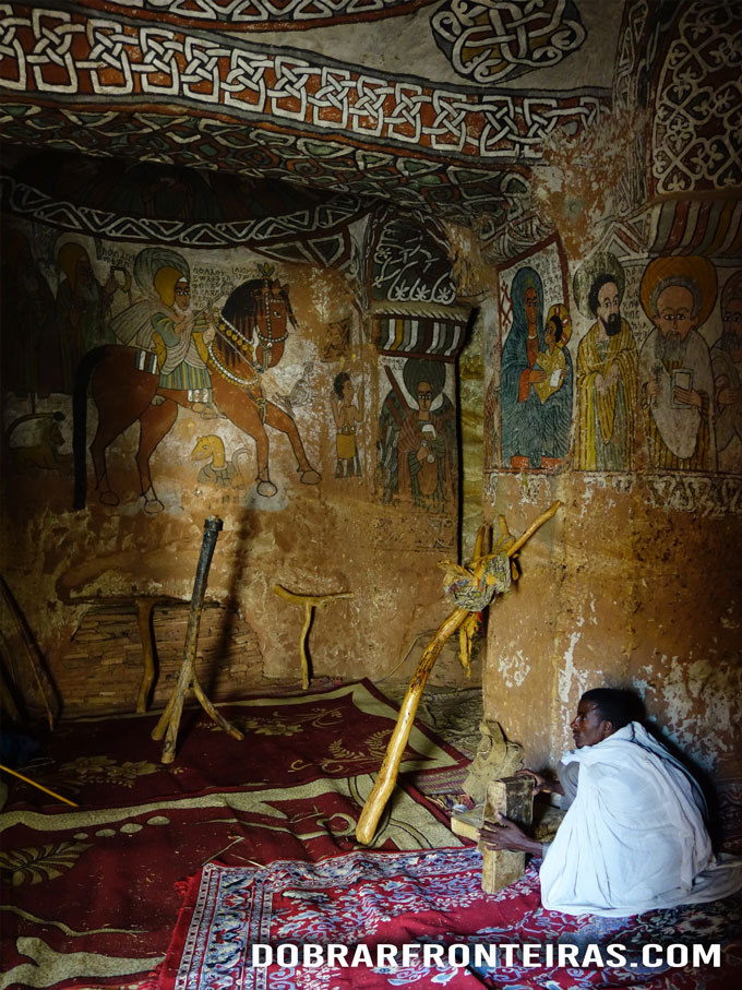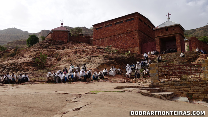 A busca pelo padre demorou uns 15 minutos e depois lá subimos. Não se entra na igreja sem antes pagar o bilhete. Repete-se o ritual de nos sentarmos no chão ou numa pedra que esteja à mão, enquanto o padre calmamente preenche o bilhete e recebe os 150Birr.