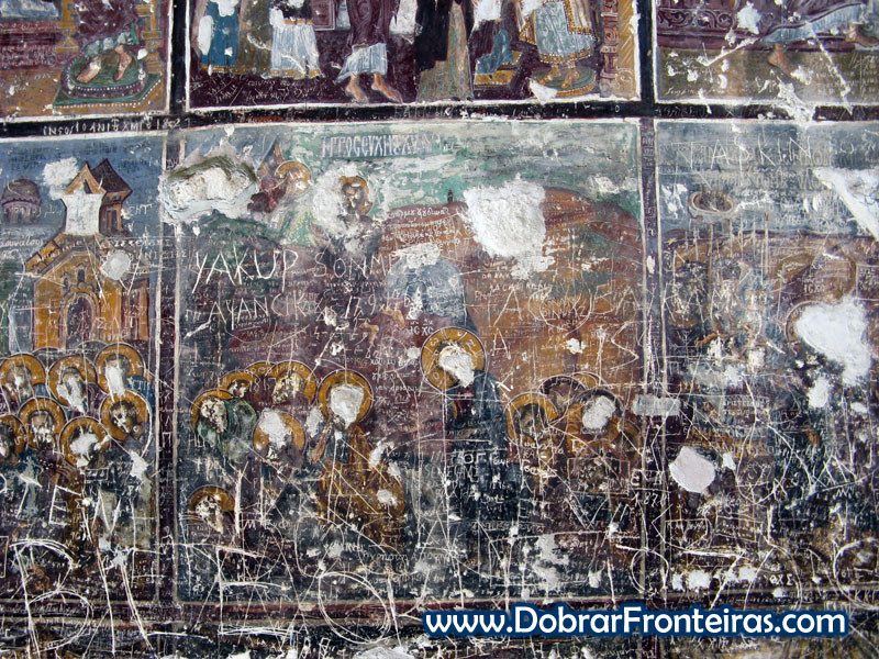 É com alguma tristeza que quando me aproximo verifico que todas as pinturas a menos de 2m de altura, e que retratavam a vida de Jesus, estão praticamente destruídas pelos grafitos que os visitantes fizeram. Mas o que espanta mais é ver como a estupidez humana não conhece fronteiras temporais nem geográficas: grande parte do estrago foi feito por visitantes turcos, russos, americanos, gregos, etc. no século XIX.