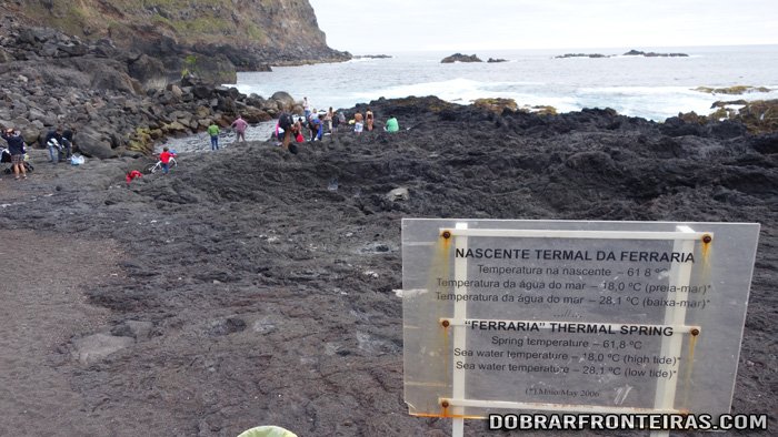 A particularidade da Ferraria é que aqui a nascente termal fica no mar. Então, podemos tomar banho nas águas do mar, que por norma são geladas nos Açores, a uma temperatura que varia entre os 18º C e os 28º C. A temperatura varia com a maré, já que a concentração de água aquecida também varia.