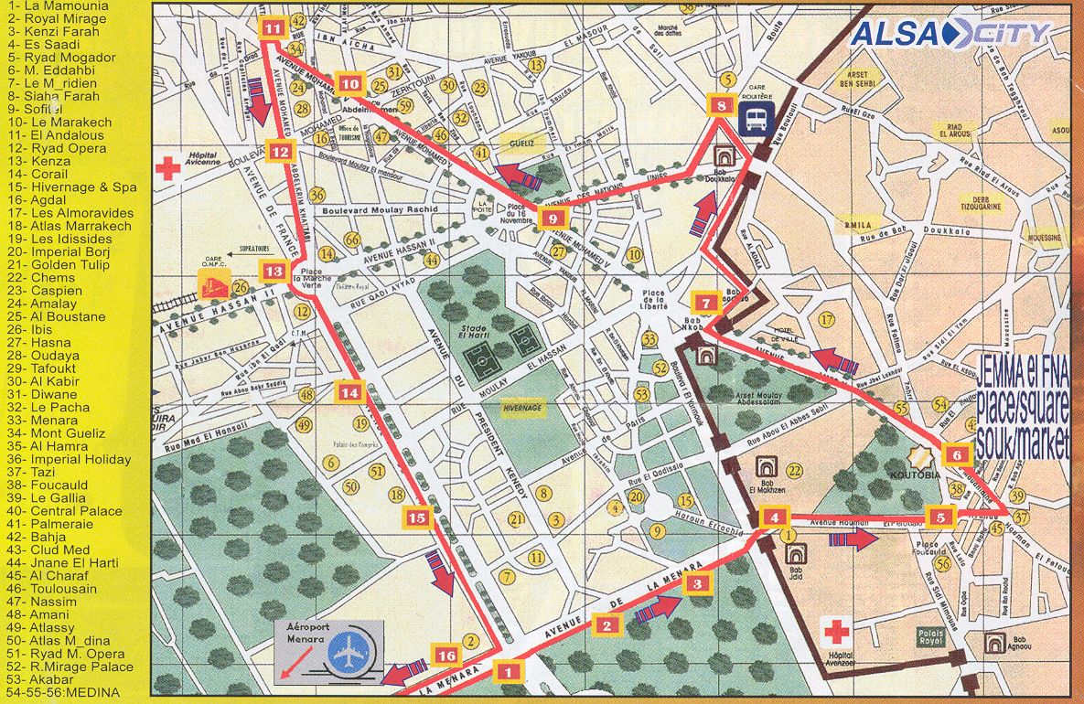 As viagens realizam-se entre as 6:15 e as 21:15 (primeira e última partidas da Praça Djema El Fna) e as 6:30 e as 21:00 (primeira e última partidas do aéroporto). Este autocarro faz ainda passagem pela Gare Routier e pela Estação de Caminhos de Ferro.